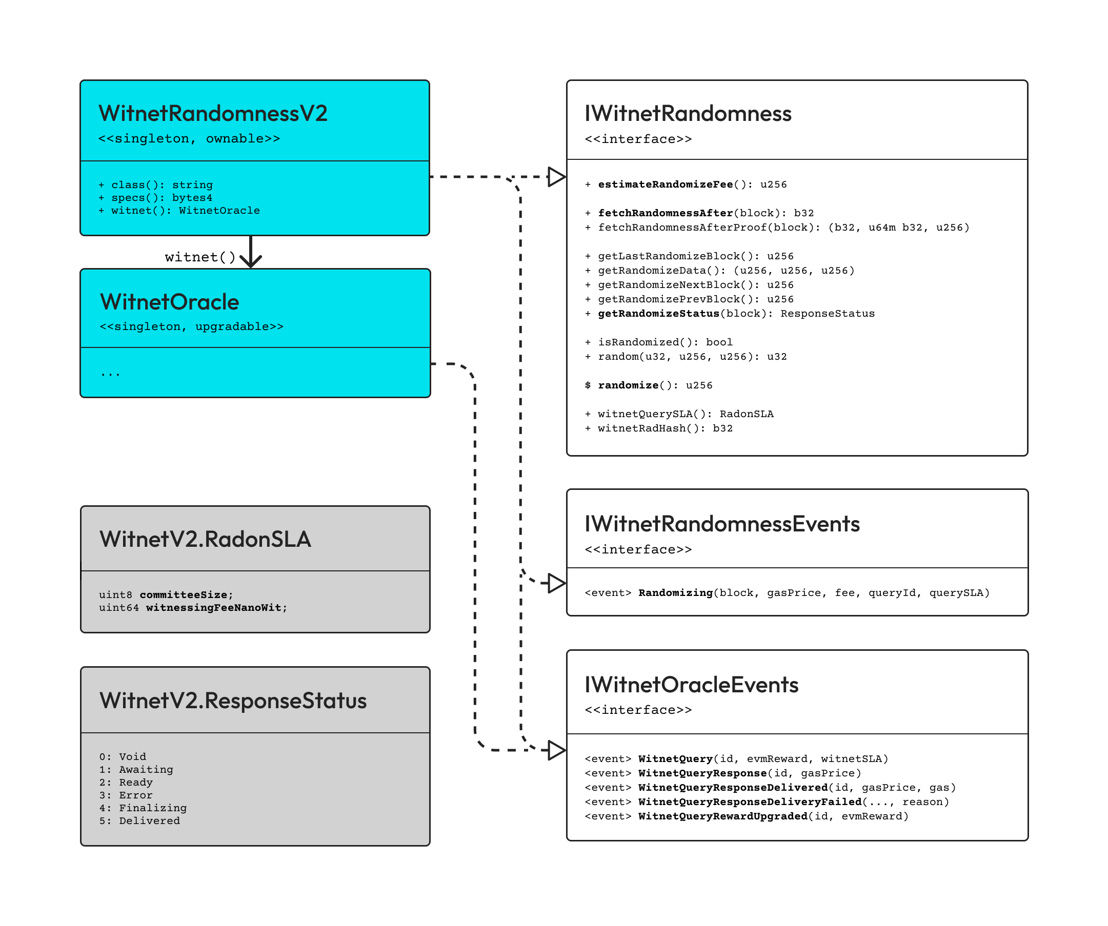 = witnet(): WitnetOracle | Address of the underlying singleton WitnetOracle contract used for posting randomness requests to be solved on the Witnet blockchain. |
